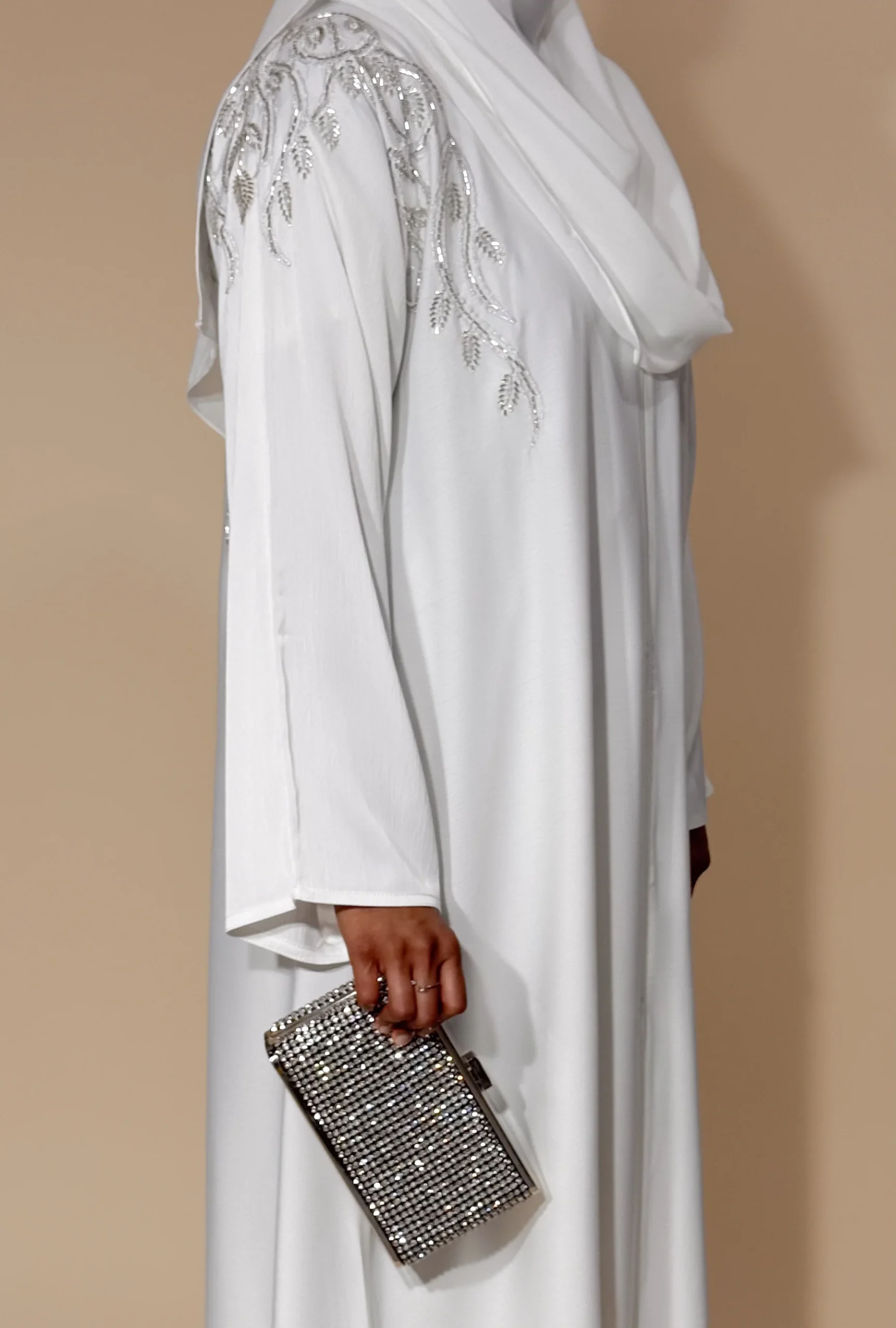 A statement in pure white Dubai silk, the Layali White abaya features a buttoned front and glimmers with silver sequin embellishment along the sleeves and shoulders. Finished with a matching scarf detailed with small floral accents, this piece is designed to shine at celebrations, exuding effortless sophistication.