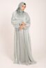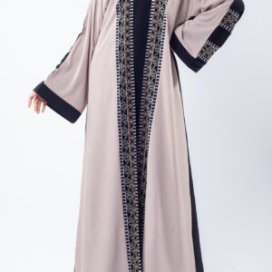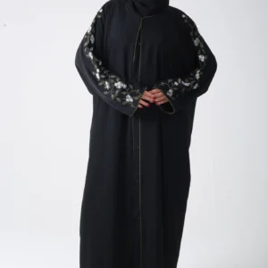 Closed abaya, crafted from premium matte Nidha fabric with floral threadwork down the collar and sleeves. Soft, flowing, and perfect for special occasions or everyday grace.